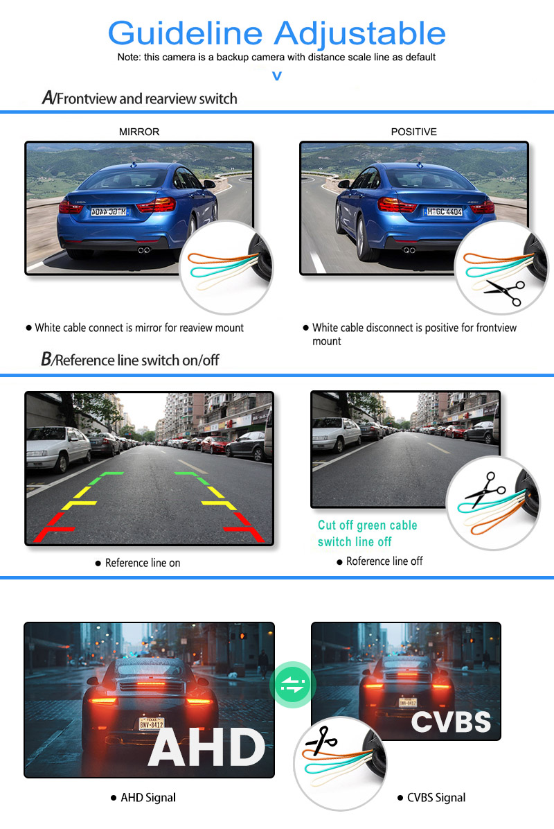 Camera marsarier dispune de linie de ghidare reglabilă, care poate fi pornită sau oprită pentru a afișa distanțele pe ecran. Există un comutator pentru vedere frontală și spate: conectarea cablului alb activează funcția de marșarier prin oglindă, iar deconectarea cablului alb permite utilizarea camerei pentru vederea frontală, pozitiv.