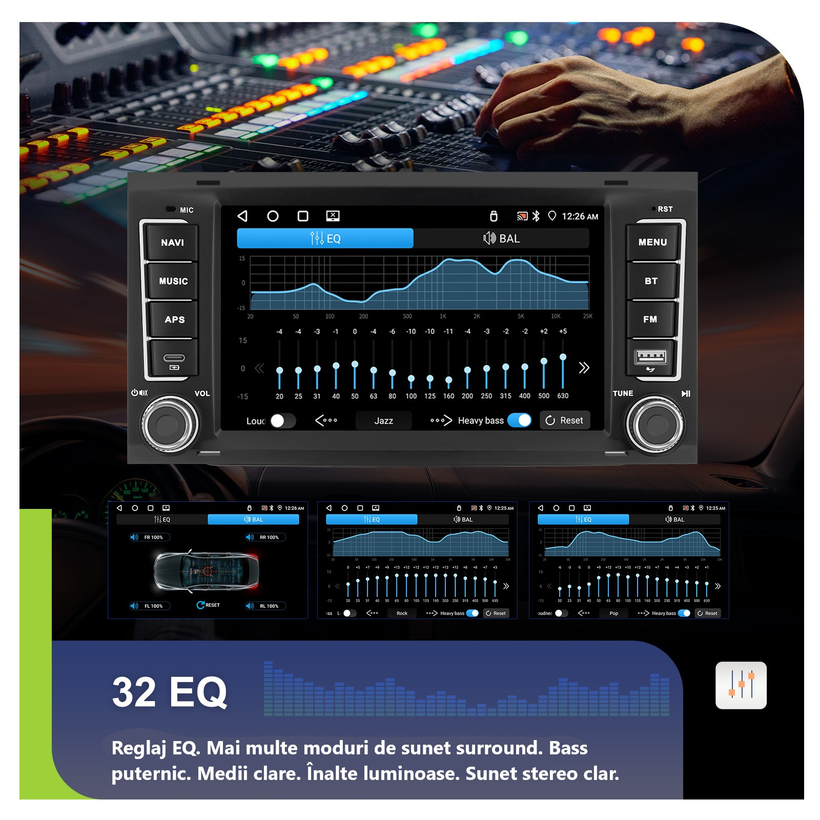 Transformă audiția din mașină. Unitatea este echipată cu un procesor de sunet digital (DSP) avansat și un egalizator cu 36 de benzi. Poți ajusta frecvențele, bass-ul și efectele surround pentru a obține o claritate audio superioară sistemului original.