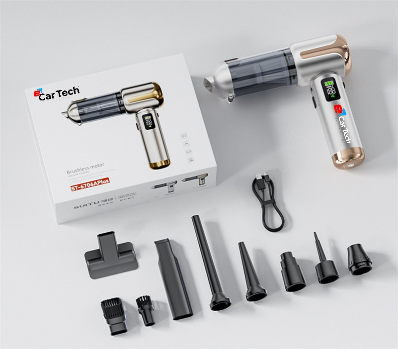 Descoperă inovația în curățenia auto și casnică! Acest aspirator portabil inteligent, fără fir, redefinește performanța datorită motorului Brushless (fără perii) ultra-rapid și a ecranului LCD integrat. Ușor, compact și extrem de puternic, este soluția perfectă pentru curățarea profundă a interiorului auto, a scaunelor, a covorașelor și a celor mai strâmte spații, oferind 4 funcții esențiale într-un singur dispozitiv premium de culoare argintie.
