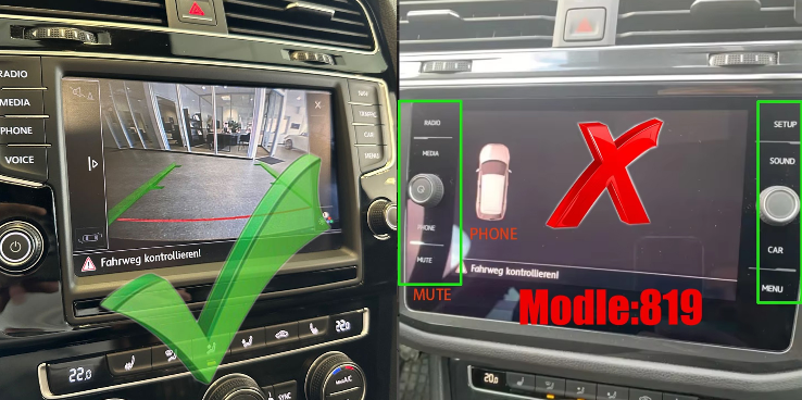 Acest kit de cameră de marșarier este proiectat pentru a funcționa perfect și a afișa corect Traiectoria Dinamică pe sistemele media de tip Full Touchscreen (unități MIB/MIB2 care afișează interfața ca în prima imagine). Kitul NU ESTE COMPATIBIL (sau necesită verificări suplimentare) cu unitățile care au aspectul și interfața Modle:819 (ca în a doua imagine). Asigurați-vă că unitatea din mașina dumneavoastră arată ca cea din stânga pentru o instalare reușită și o funcționare garantată.