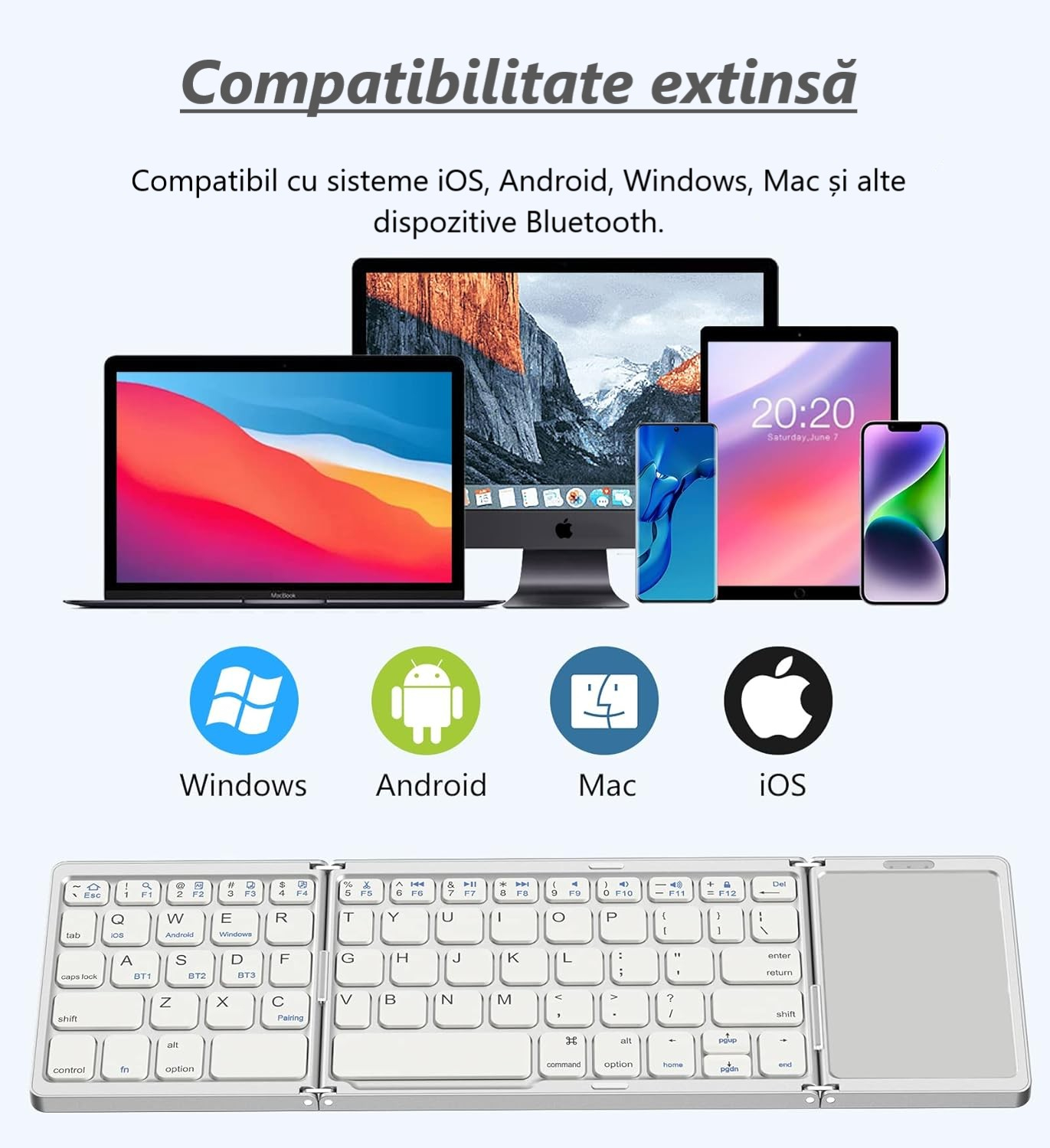 Tastatură Bluetooth pliabilă cu touchpad – ultra-portabilă, compatibilă cu iOS, Android, Windows și macOS. Comută între 3 dispozitive, are autonomie de 60h și design compact, ideal pentru lucru de oriunde.