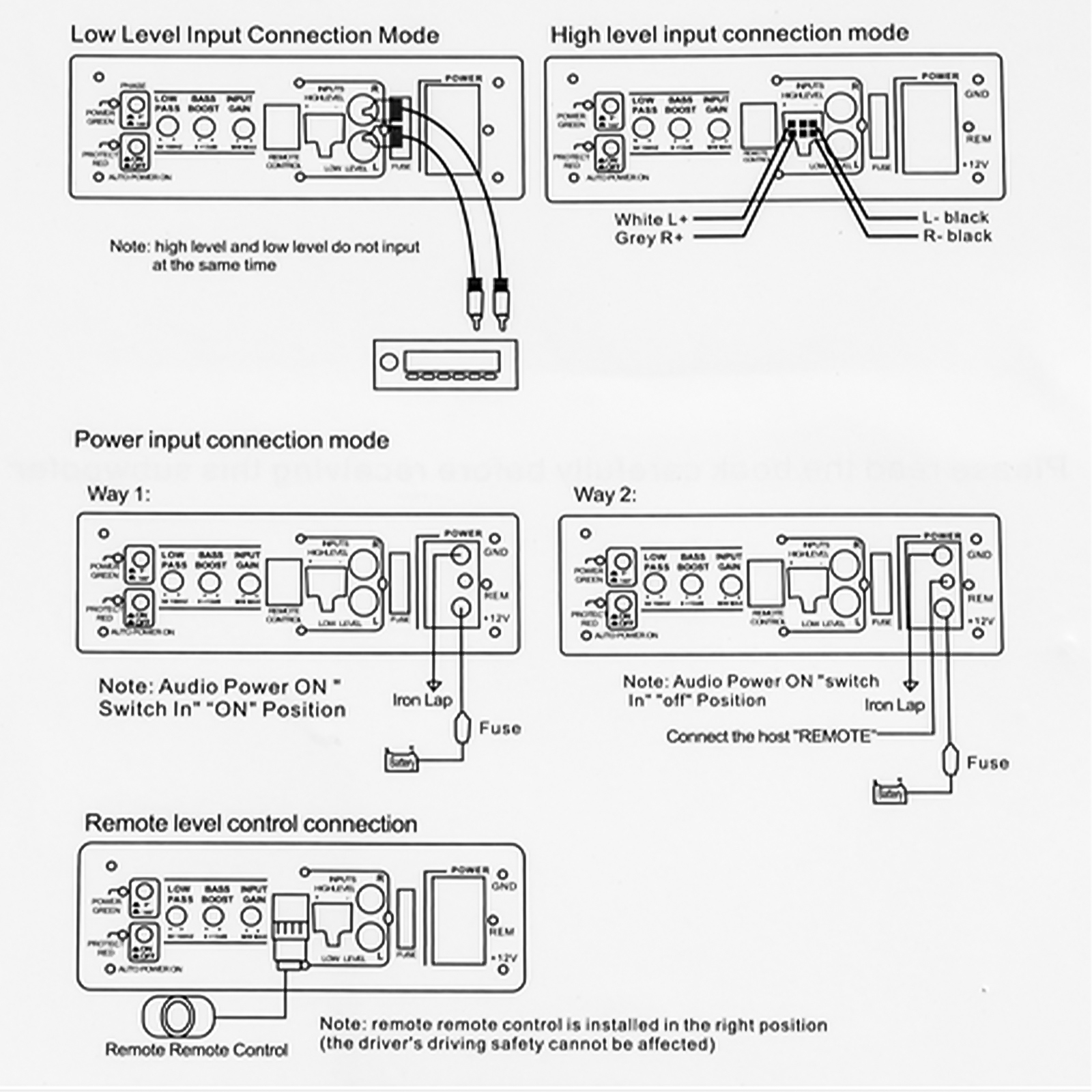 • Amplificator: integrat, intrări Low level (RCA) și High level.
